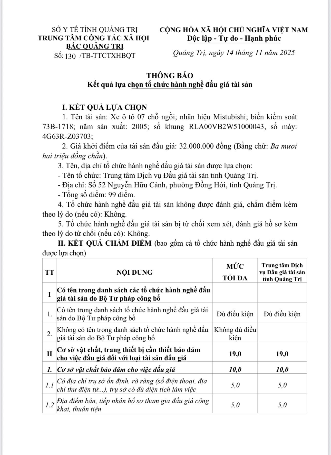 THÔNG BÁO KẾT QUẢ LỰA CHỌN TỔ CHỨC HÀNH NGHỀ ĐẤU GIÁ TÀI SẢN