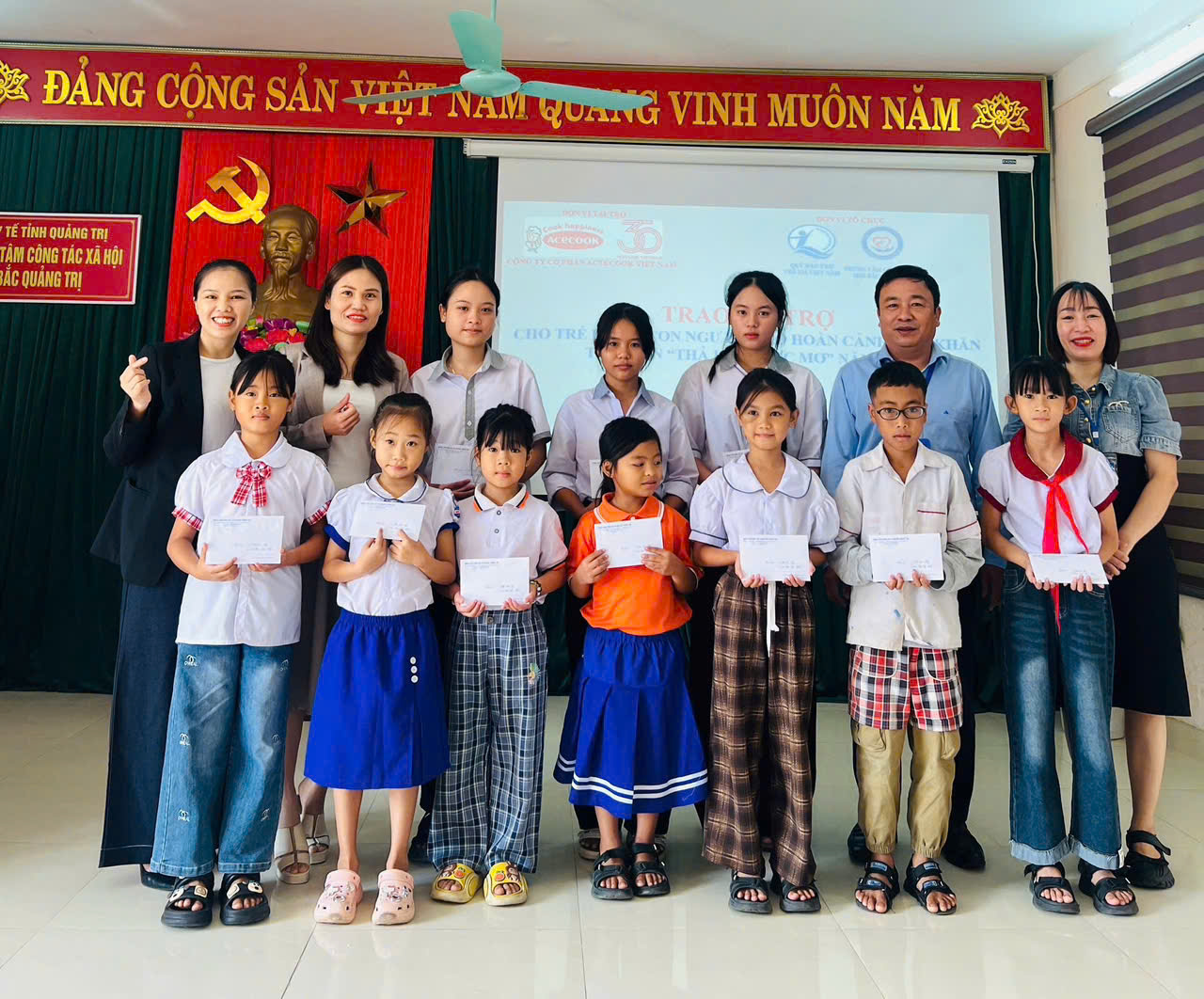 Đại diện nhà tài trợ, Lãnh đạo Trung tâm Công tác xã hội Bắc Quảng Trị, cán bộ xã, phường trao học bổng cho học sinh tại xã Lệ Thủy